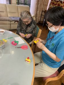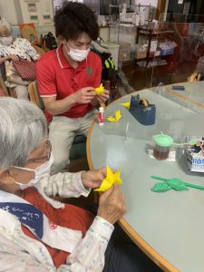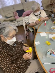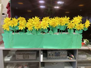 合作ッ!(^○^) 2021.08.04 デイサービス こんにちは! ハッピーデイサービスセンターです(^^) 今回は、利用者様とスタッフによるヒマワリの作品をご紹介しますッ! 折り紙で花びらや葉っぱ、茎を作っていきます! 細かい作業なので、スタッフも一緒に作成しておりますッ! ジャンッ! 完成するとこうなります〜(^○^) ステキなヒマワリ畑ができましたね! お疲れ様でした〜(^-^)