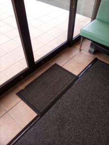到着されたら消毒液のしみ込んだマットで靴の裏をきれいにします。