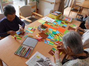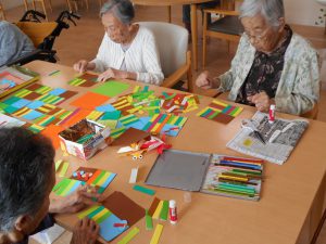 台紙へ短冊に切った折り紙を一つ一つ丁寧に貼って頂いています。