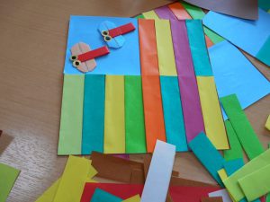 短冊を切って貼り、赤とんぼの羽の部分と胴体の部分がすごく細かく