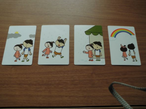 4枚の絵をお話の順番に並び替えてもらい、1枚ずつ絵の状況をお話してもらいます。