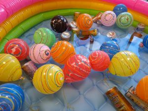 ゲームは、ヨーヨ釣り、射的、風船飛ばし、箱の中身は何でしょうの4種類が