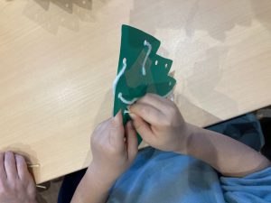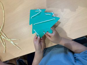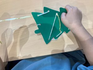 お子さんたちは、「次はどの穴に通そうかな?」や「真っ直ぐに通していこう!」とデザインを考えながら通したり、様々なクリスマスツリーが完成しました!!
