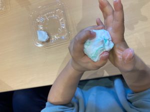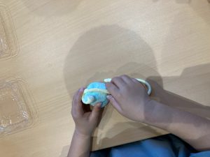 あらかじめ粘土に絵の具を少量乗せておき、色が変わっていく変化を混ぜながら感じてもらいました。