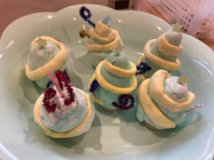 ツリーの飾りも粘土を細く伸ばしたものをツリーへ巻き付けて、モールもつけて、最後に星型のピックを頂上に差し、クリスマスツリーを完成させることができました!!!