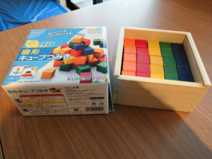 5色のカラー積み木が入っており、見本通りに積み木を並べたり重ねたりして形を作っていきます。