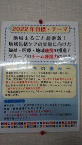 ハッピーサービスグループの理念 2022.01.22 訪問看護 今年のハッピーサービスグループの目標です!! 事務所内で視点が行き届きやすいところに、掲示しています(・・)/ 訪問従事者とすては、在宅により密なサービスをお届けすることが多いので、 何気ない困りごとや少し工夫すれば改善できることもたくさんあるので、 みなさまに寄り添っていけるように2022年も頑張っていきます(^^)