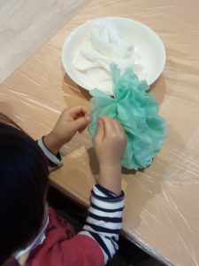 お花は、お花紙でつくりました。束ねたお花紙を指で一枚ずつめくって広げていき、花びらの形に整えたら完成です。