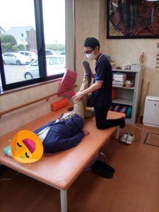 写真はパーキンソン症状がある利用者様にストレッチングをしている様子です。