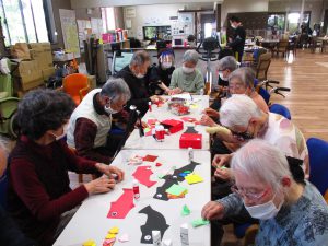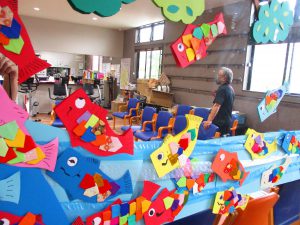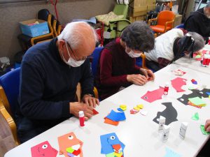 まずは、色々な色の画用紙に鯉の型取りをして切っていきます。とても効率良く作業され、予想以上の鯉が出来ました。別の日には鯉の鱗を折り紙で大量に作りました。