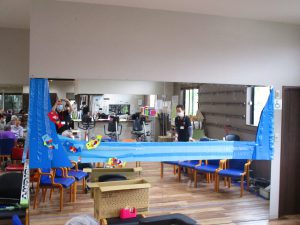 鏡に画用紙と、ビニールテープで下絵を作って、皆さんの指示を聴きながら、どんどん鯉を貼って行きます。