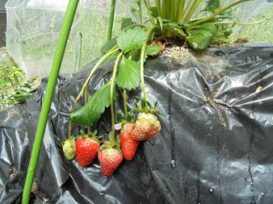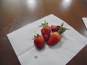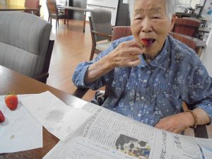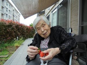 可愛いイチゴが育ちました。 2022.05.13 ガーデン大安寺 春の日和に庭のツツジが満開に咲きました。 長閑なガーデンの畑で、秋から植えていたイチゴも次々と赤い実をつけていました。 真っ赤に美しく美味しそうなので、早速いちご狩りしてみました。 摘みたてイチゴを食べて感想を頂きました。入居者様「まだ酸いいな、もちょとや。でも自然の味や、たくましいわ!」との事でした。イチゴが完熟するまで、もう少しお待ちくださいね。