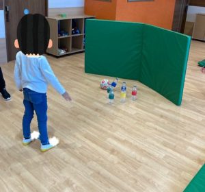 5本のペットボトルのピンへめがけてコロコロとボールを転がして遊びました。