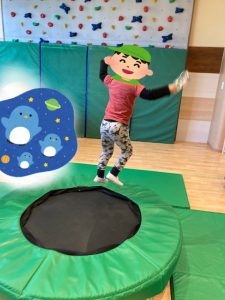 ペットボトルの中にビーズなどが入っている物を手に持ちながら、トランポリンを跳びました。