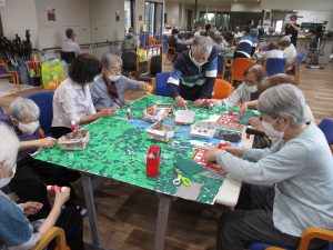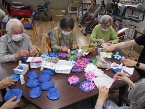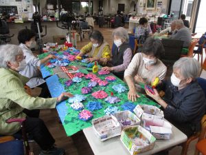 紫陽花は台紙にお花紙を貼って、画用紙を切り抜いた色とりどりの花びらを貼っていきます。とても細かい作業なのに皆さん嬉しそうにどんどん作っておられました。