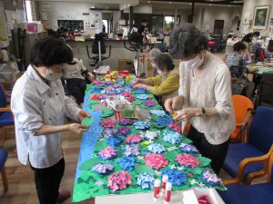 作った紫陽花を矢田寺の契り絵の上に配置して、バランスを見ながらどんどん貼って行きます。「そこは紫の方が良くない?そこ隙間空きすぎちゃう?」など真剣そのものです。利用者さんの1人が家で作ったカエルも「可愛い!!」と言いながら、皆で楽しく貼りました。
