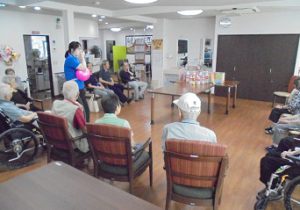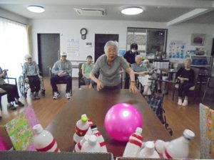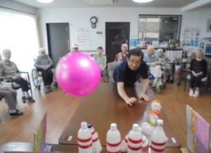 ガーデンでもボウリングの日を記念して、卓上ボーリング大会を実施しました。机の上にピンを置き、参加しやすいように目線の高さで挑戦して頂きました。