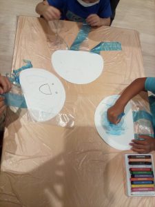 くらげにクレヨンを使って模様を描きました。ハートや星、お顔など、それぞれに個性あふれるくらげが完成しました♪