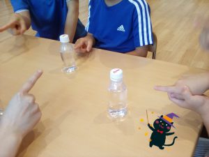 水が入っているペットボトルに折りたたんだクレープ紙を入れて、フリフリと振り、色が変わっていく変化を楽しみました!!