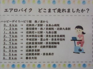 エアロバイクのモニターの上には、当館ならではで、進んだ距離に応じて、どこまで行けたのかを分かる様にしています。
