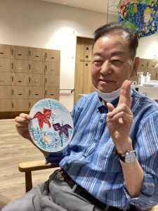 金魚の絵を塗って絵具で色付けし、裏面にはお好きな文字を書いていただき、オリジナル団扇を製作していただきました。