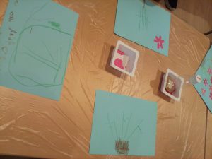 コスモスは、土や葉をクレヨンで描いて、最後にお花型のスタンプを押しました。