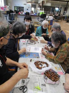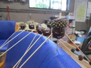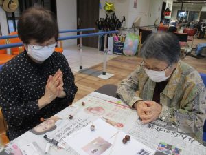 公園や、山で拾ってきた煮沸消毒済みのドングリの中から、好きなのを選んで、子供の頃遊んだ昔話をしながら作業を進めます。