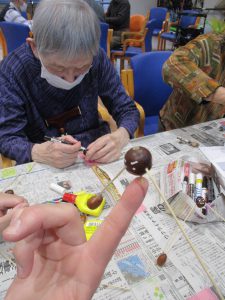ドングリに錐で穴をあけて、爪楊枝を刺して、模様を描いたらコマの完成です。良く回るコマを見て皆さん嬉しそうに喜ばれました。