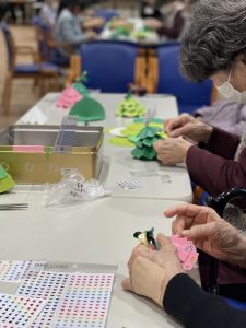 好きな色の画用紙を三枚の違う大きさに切り取り、それぞれ4つに折り山と山の間を谷折りにしたものを重ねます。皆さんスタッフより上手に器用に折っておられました。素晴らしいです!!