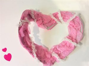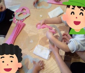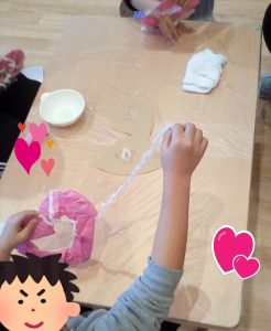 次に、お花紙を使って、バレンタインデーの飾りを作りました。