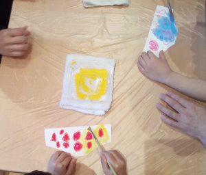 パンツにクレヨンで模様を描き、絵の具ではじき絵をしていきました。子どもたちは、色の組み合わせや形など想像を膨らませながら、楽しそうに取り組んでいました。