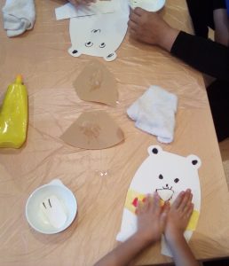 ハート型の台紙に、お花紙を巻き付けたり、貼ったりして、ピンクのクリームの様に見立てて、最後に、もこもこの白い毛糸を巻き付けて、可愛い飾りが出来上がりました。