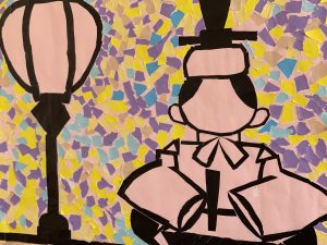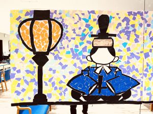 ピンクの模造紙にお雛様とお内裏様の下絵を描き、黒色紙で輪郭を貼っていきます。そして周りには紫や黄色などの淡い色紙を契って貼りました。