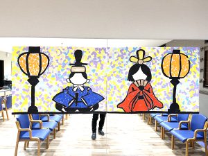 皆様いかがお過ごしでしょうか?季節が進み暖かい日もだんだん多くなってきましたね。でもまだ寒暖差が激しいので体調管理には気をつけていきましょう。さて、ハッピーリライフでは、雛飾りの壁画を作成しました。