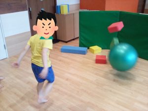 はじめに、大きなセラピーボールを投げて少し離れたところに積み上げたバランスブロックを倒しました。一回で全て倒せるとやったー!という歓声が上がりました!