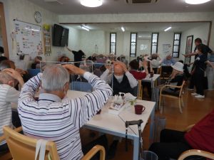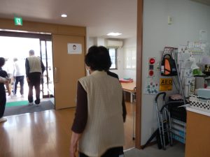 館内に地震速報が鳴り響き、何か頭上から落下してくるといけないので、利用者様に頭を守ってもらいます。