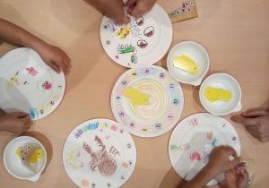 紙皿にクレヨンで思い思いの絵を書きました。書いた絵を指さしてピカチュウ!サッカー選手!とスタッフに説明してくれる子どもたち。数字を書いた丸シールを貼り、スタッフが手伝いながら針をピンでとめると、時計の完成です!!