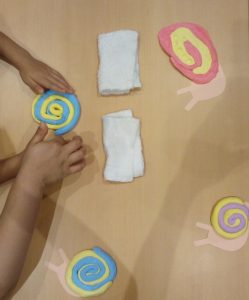 黄色の粘土と合わせて二本の”ヘビ”をつくり、くるりと巻いたらかたつむりの殻になりました!