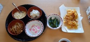 うどん、おにぎり、天ぷら(かき揚げ)等ボリューム満点で、