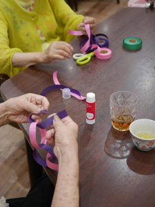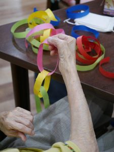 それから、紙テープで輪っかを作って、こちらは大きな首飾りを作っています。