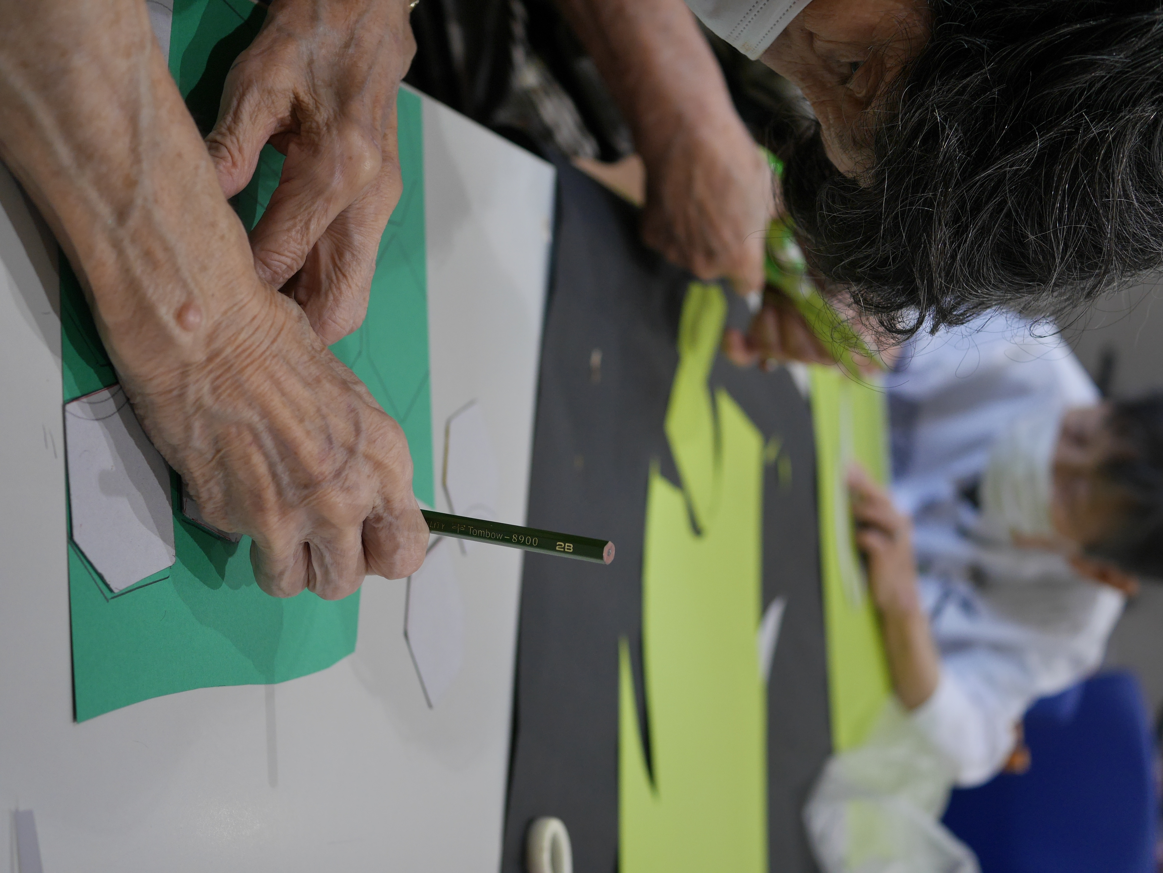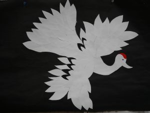 写真では少し見にくいかもしれませんが・・・鶴は何枚もの白い画用紙が重なって、綺麗な羽になっています。
