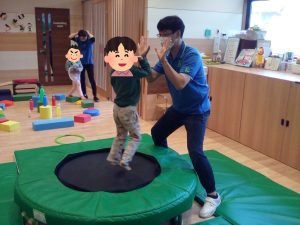 一人で跳んだり、スタッフと手をつないで跳んだり、楽しい気持ちを上手く発散してくれていました。