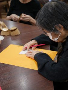 そして、秋らしい物を書いた厚紙を、画用紙に置き、型取って、ハサミでチョキチョキ・・・