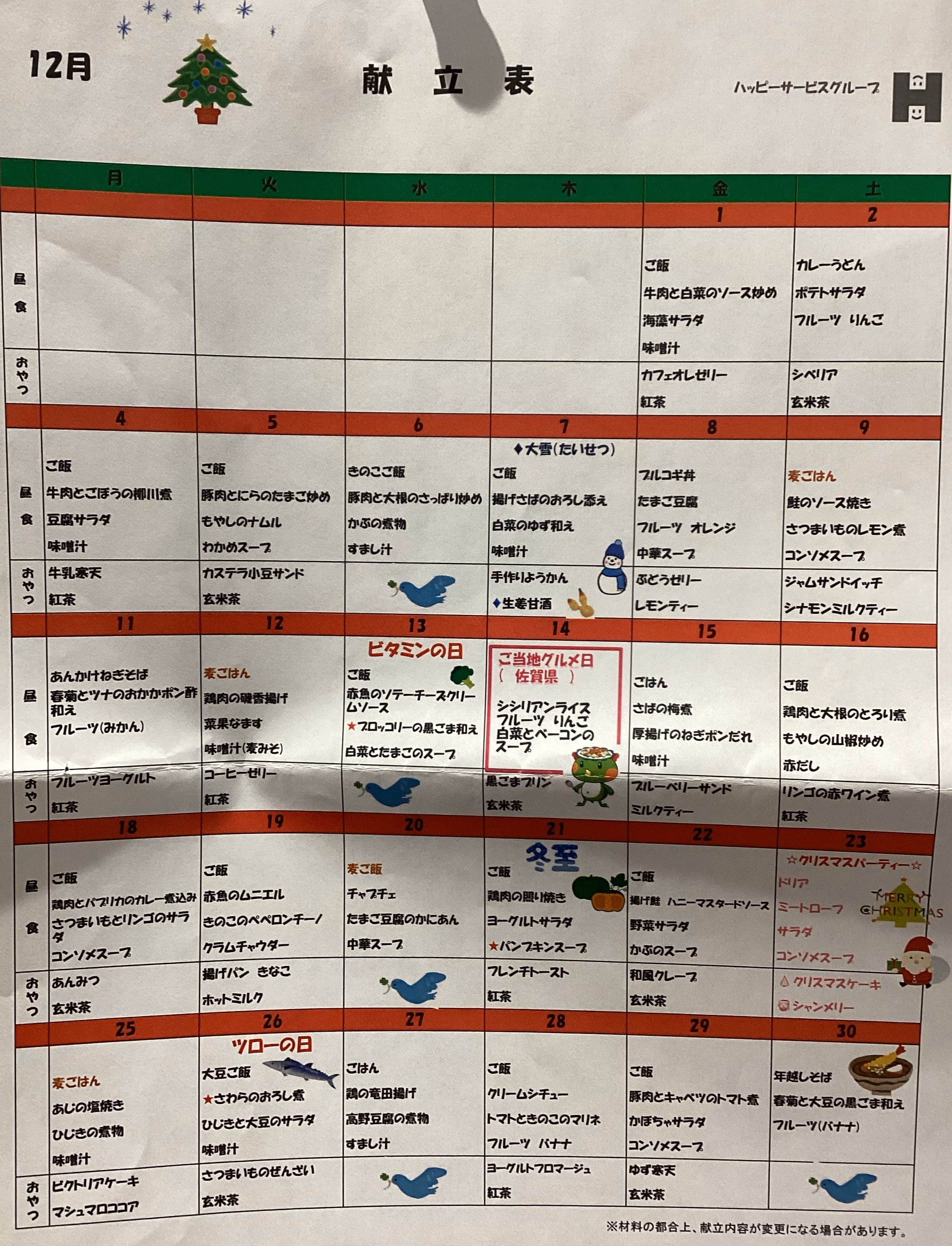 12月献立♫ 2023.11.27 リライフplus こんにちは(*^▽^*) ハッピーリライフplusです。 今年も残り約1か月となりました。 風邪を引かないように、体調管理に気を付けてお過ごしください♪ 12月は、クリスマスのイベントがあります!! 今年も、豪華な料理!スタッフによる楽しい演出! シャンメリーで乾杯!ホールケーキのご用意もしています☆★ リライフplusでは、12月23日に行います(^^♪ 皆さま、ぜひぜひご利用してくださいね♡ 12月の献立です♡