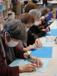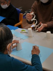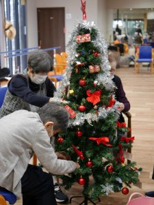 仲良しの女性利用者様にお願いすると「先生、任せてください!」と力強く言ってくださり、「星はここがいいかな?」「赤ばっかりだから、白もここに入れたらどう?」など利用者様同士で相談しながら取り組んでくださりました!
