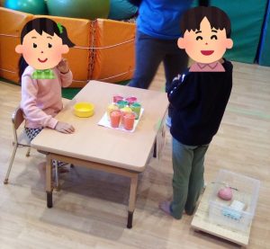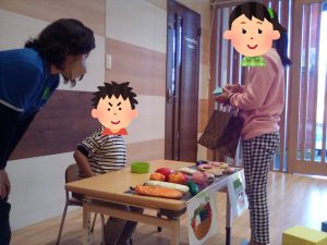 八百屋さん、パン屋さん、ジュース屋さんの店員さん役、お客さん役を交代して行い、買い物の時のやり取りを楽しんでもらいました。