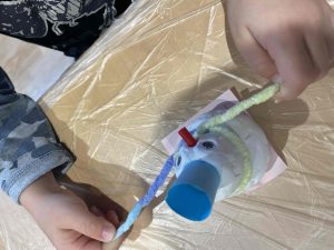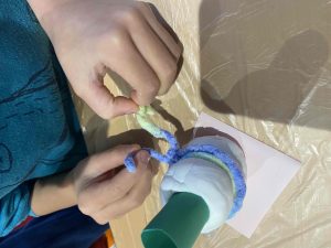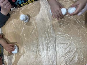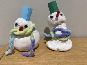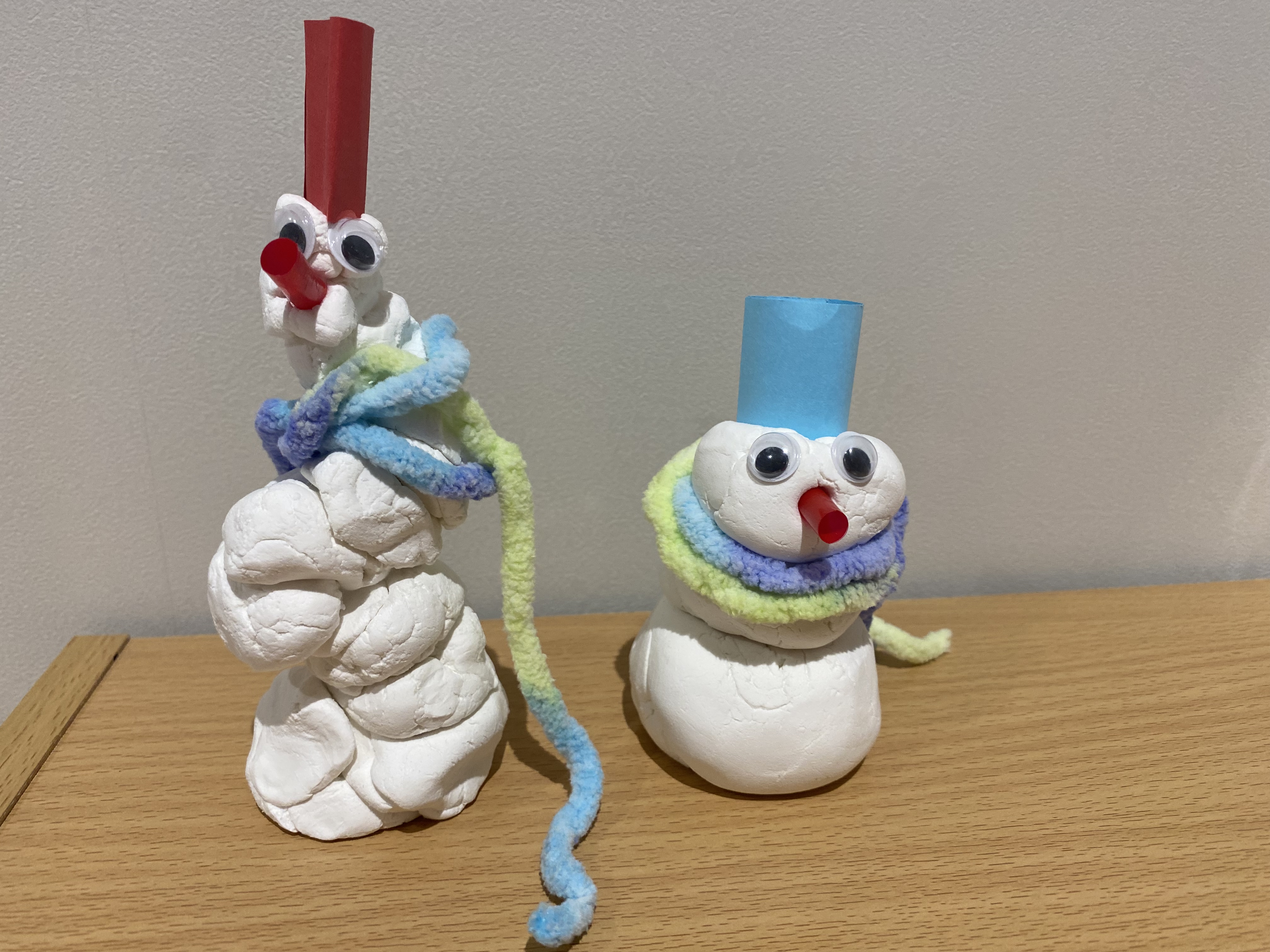 紙粘土を使って、雪だるまの体・顔と作りました。きれいな丸を作るのに、小さなおててで、しっかり整えてくれました♪