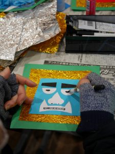 意外と難しいポイントが、鬼の顔の下に貼っている、この金銀の折り紙なんです。