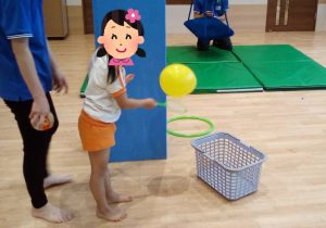 サーキットコースでは、ボールを足の間に挟んで連続ジャンプをしたり、ポイで風船を運んだりして楽しんでもらいました。