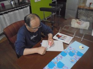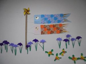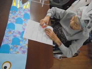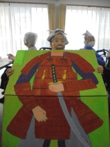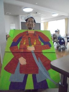 5月のレク紹介です。 2024.06.10 ガーデン大安寺 5月はこどもの日に鯉のぼり作りレクリエーションを実施しました。 全員で協力しながら一枚ずつウロコや目玉をつけて1メートルを超える立派な鯉のぼりを完成させました。 完成した鯉のぼりは5月中旬まで玄関フロアで悠々と泳いでいました。 この他、皆様には毎年恒例の新聞紙で大兜織に挑戦していただきました。 自身で織った新聞紙兜を被り、顔出しパネル絵で侍に変身して頂きました。 男性も女性も一緒になって武者のコスプレを楽しまれていました。